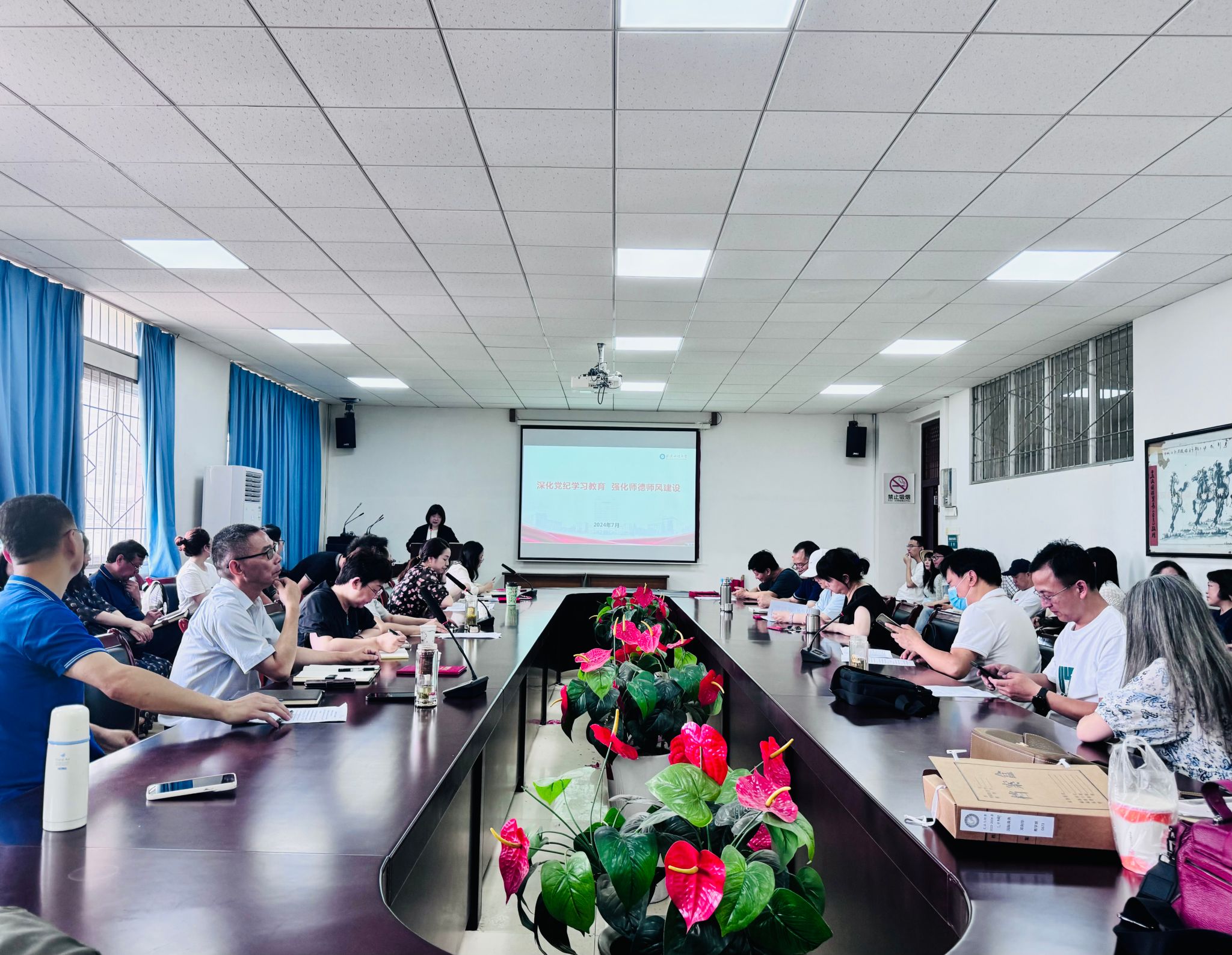 杨彦结合《2024年警示教育典型案例集》、教育部通报的违反师德师风典型案例等,围绕政治纪律、组织纪律、廉洁纪律、群众纪律、工作纪律、生活纪律六个方面进行详细解读,提醒大家要时刻保持头脑清醒,认真对照反思,严守纪律红线,杜绝违法违纪行为。杨彦强调,“纪严于法,纪在法前,纪法分开”,要求全体教职员工严格遵守党的纪律,做到心有所畏、言有所戒、行有所止。
