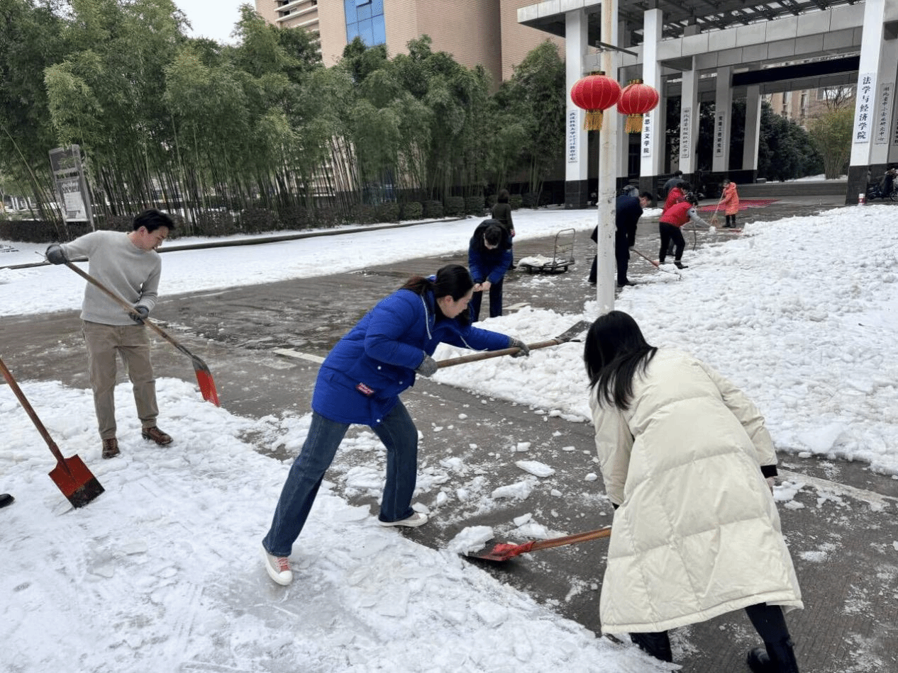 为确保师生工作学习、生活出行和校园安全,法学与经济学院党委根据学校统筹安排,积极行动、主动作为,第一时间组建党员突击队,学院领导班子率先垂范、带头行动,组织师生投身到清雪除冰行动中。2月23日,院党委书记杨彦、院长袁年兴统一部署,带领班子成员和党员教师迅速行动、清雪除冰,有效清理教四楼门前积雪。