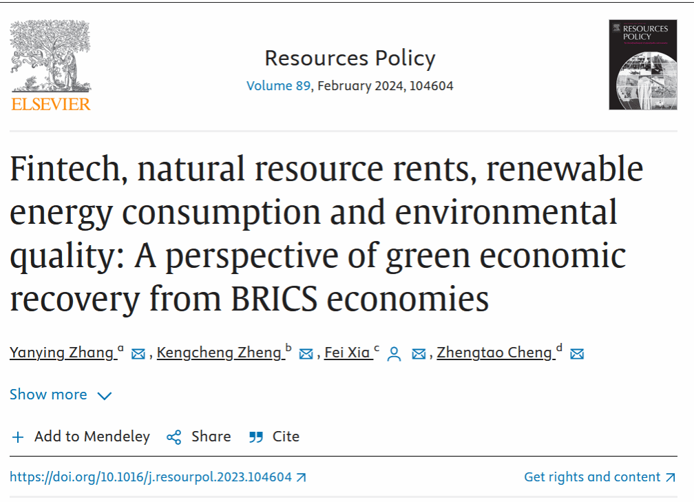 行政管理系张彦英副教授的研究成果Fintech, natural resource rents, renewable energy consumption and environmental quality: A perspective of green economic recovery from BRICS economies在全球经济学知名期刊Resources Policy发表。