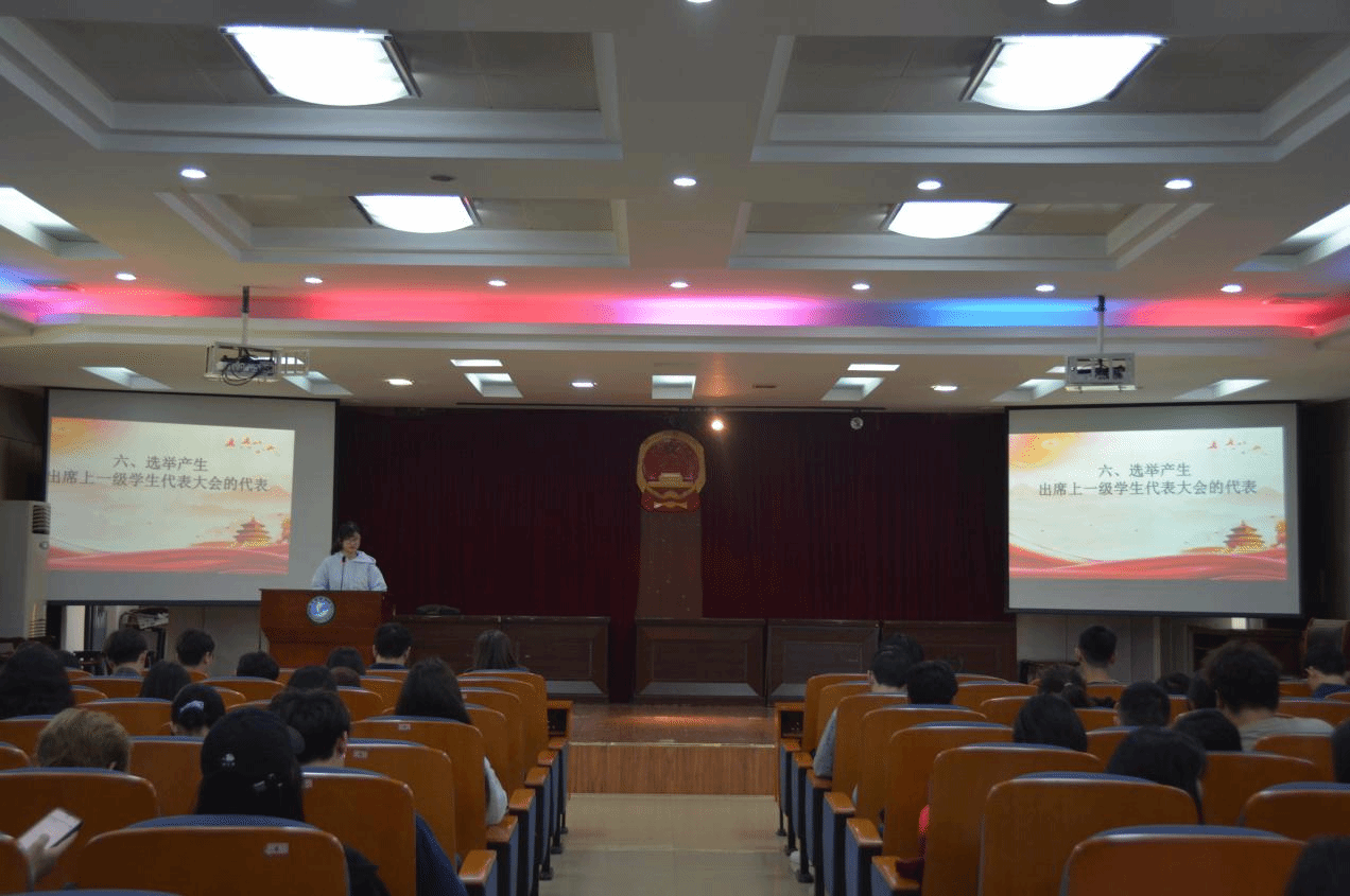 本次大会在全体成员起立奏唱国歌中拉开序幕。刘英书记在开幕式致辞中首先肯定了上一届学生干部的工作,并从明确职责、加强学习修养和兼顾工作三个方面向新一届学生干事做出具体要求。