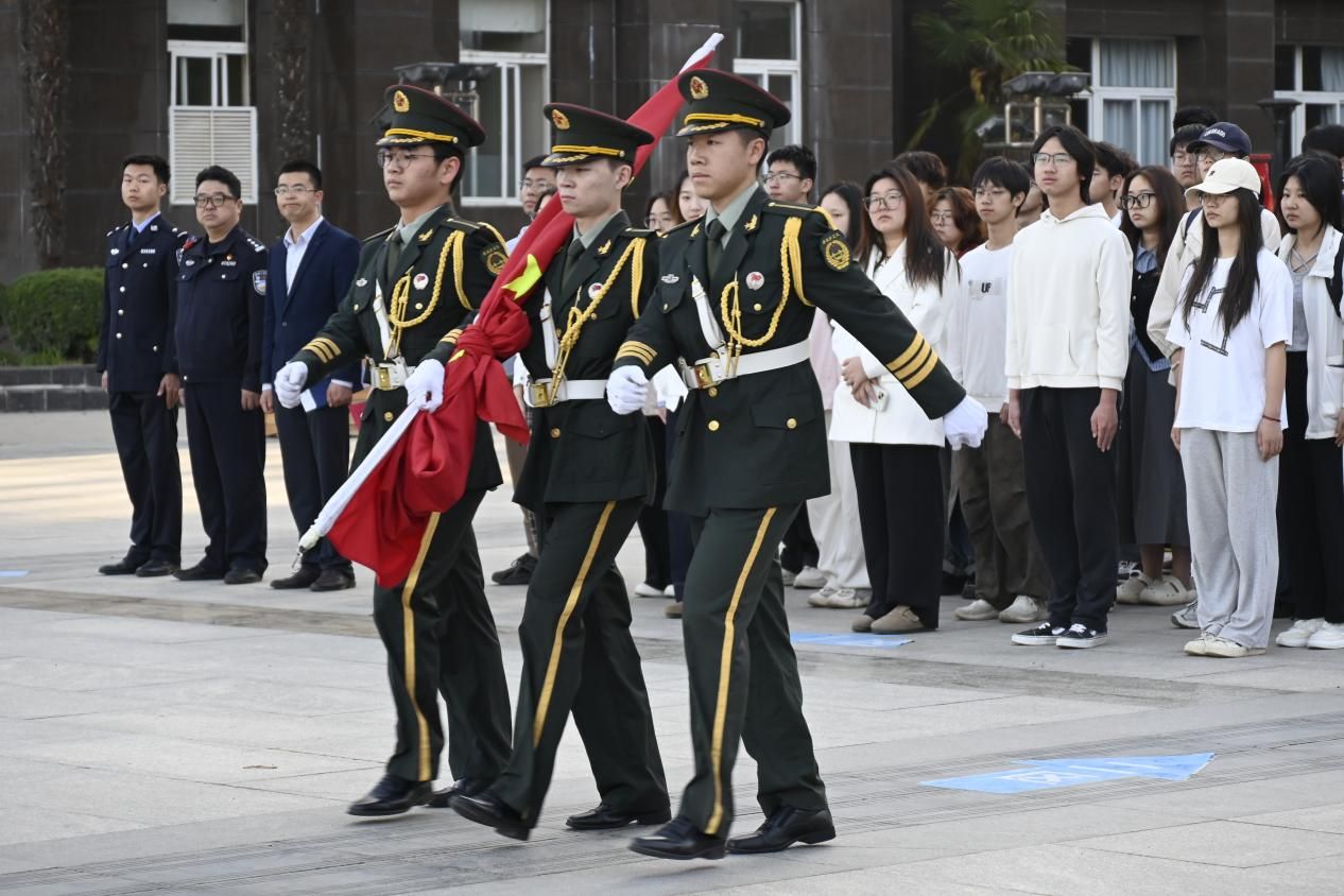 仪仗队员步伐矫健、目光坚定,护卫国旗进场;全体师生有序列队,庄严肃立,在雄壮的国歌声中目视五星红旗冉冉升起。
